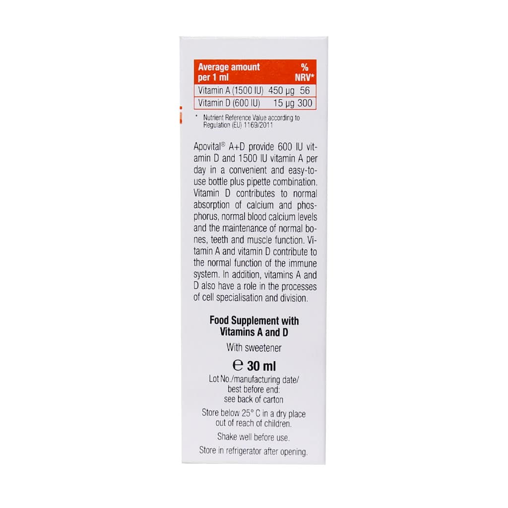 قطره خوراکی ویتامین آ+د آپوویتال تحت لیسانس کشور آلمان به تامین ویتامین A و D مورد نیاز بدن کودکان و نوزادان میپردازد. این دو ویتامین در دوران نوزادی برای رشد و استحکام استخوان و دندانها مناسب است و میتوان گفت بهترین مولتی ویتامین کودکان است. ویتامین دی موجود در این محصول به تامین سطح نرمال کلسیم و فسفر کمک میکند. همچنین در حفظ سطح نرمال کلسیم خون و حفظ سلامت استخوانها، دندانها و عملکرد عضلات موثر است. ویتامین A هم موجب سلامت چشم و بینایی شده و سیستم ایمنی بدن را بهبود میبخشد. با توجه به کارایی موثر این محصول میتوان آن را در زمره بهترین مکمل کودکان دانست.