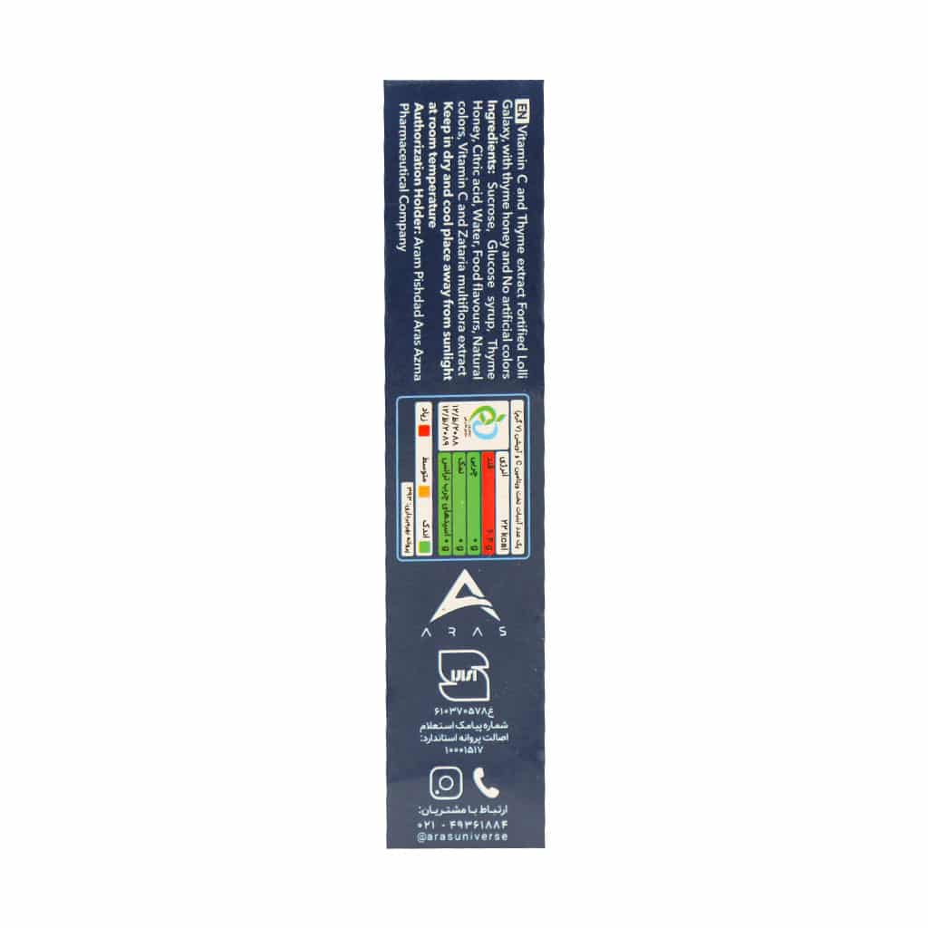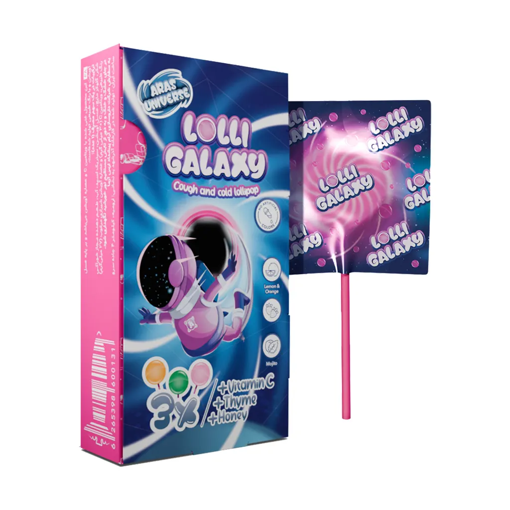 آبنبات لالی گلکسی ارس یونیورس با طعمهای متفاوت و با بهره گیری از ترکیبات موثر مانند ویتامین C و عصاره آویشن بر پایه عسل به کاهش علائم بیماریهای تنفسی، سرفه و تسکین گلودرد کمک میکند.