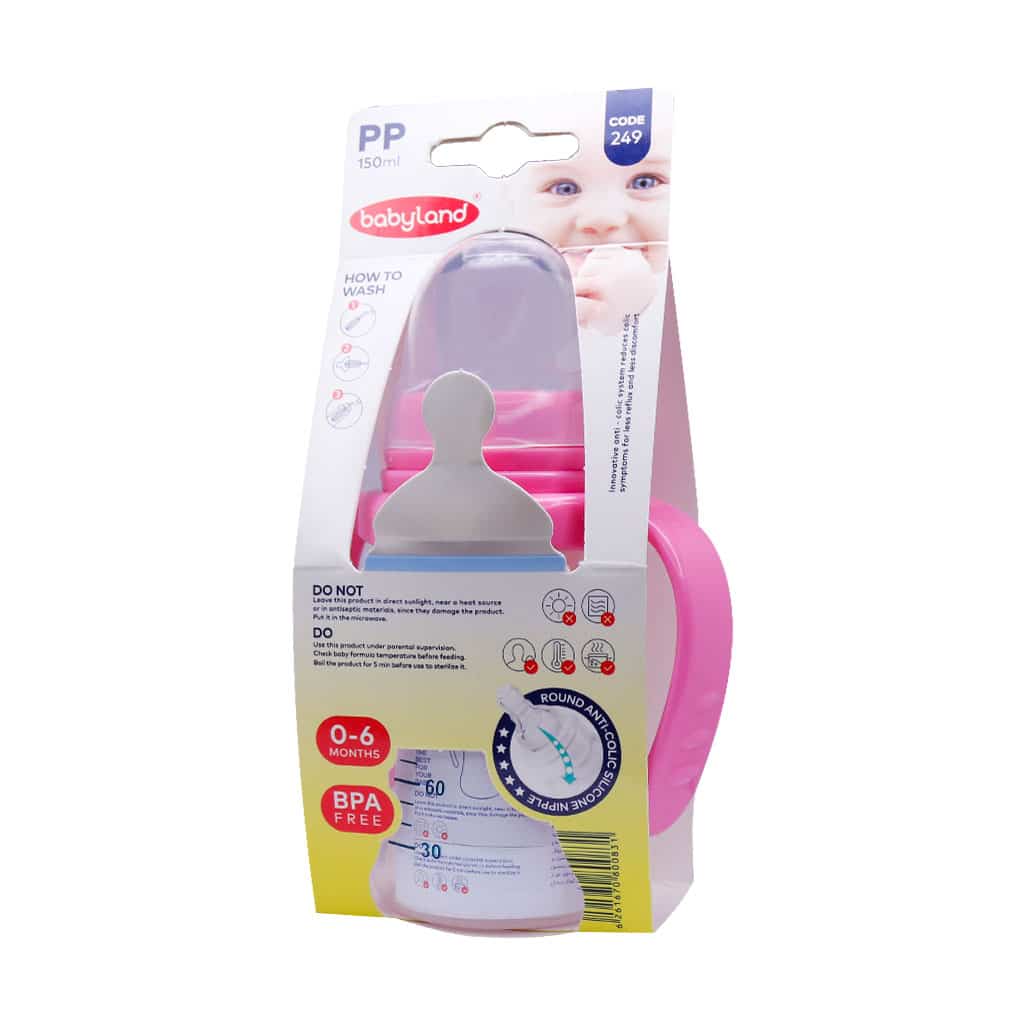 شیشه شیر دسته دار آنتی کولیک بیبی لند کد 249 مناسب نوزادان 0 تا 6 ماه بوده و فاقد BPA است. این شیشه شیر با سری فندوقی هیچ گونه آسیبی به فک نوزاد نمیرساند.
