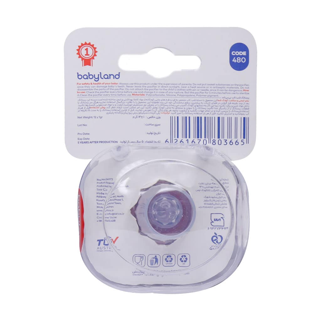 پستانک فندقی شب تاب بیبی لند کد 481 برای نوزادان در سن 6 تا 18 ماه مناسب است. نوع سری آن گرد و جنس آن از سیلیکون نرم بوده و دارای دسته شب تاب است.