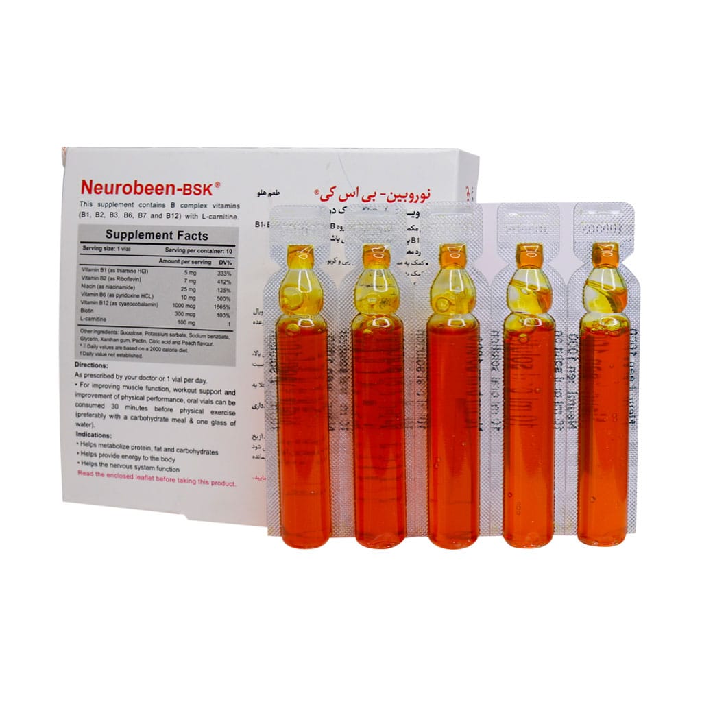 ویال نوروبیون بنیان سلامت کسری حاوی 10 عدد ویال خوراکی که تامین کننده ویتامینهای گروه B به همراه ال کارنیتین است و میتواند جایگزین خوبی برای آمپول نوروبیون باشد. ویتامینهای ذکر شده در ویال نوروبین بی اس کی باعث افزایش متابولیسم انرژی بدن میشود و تاثیر مستقیمی بر متابولیسم چربیها، کربوهیدراتها و پروتئینها دارد. نوروبیون خوراکی مایع میتواند یک مکمل مناسب برای ورزشکاران نیز باشد و باعث افزایش قدرت عضلات و همچنین بهبود عملکرد ورزشی آنها شود.
