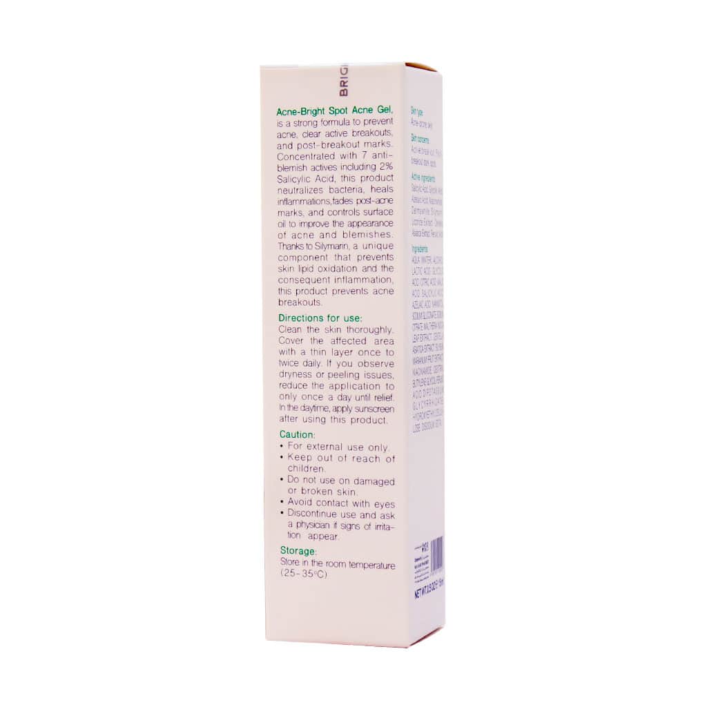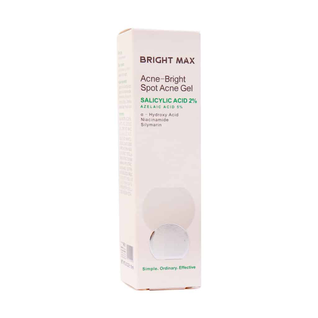 اسپات ژل آکنه برایت برایت مکس با فرمولاسیونی قوی همراه با اثربخشی سریع برای پیشگیری و بهبود موضعی آکنه و لکهای به جای مانده از آن است. در این محصول 2 درصد سالیسیلیک اسید به همراه هفت ترکیب موثر دیگر وجود دارد که با اثرات اختصاصی ضد باکتری و ضد التهاب باعث رفع آکنه و کنترل چربی پوست، بهبود جوش و لک ناشی از آن میشود.