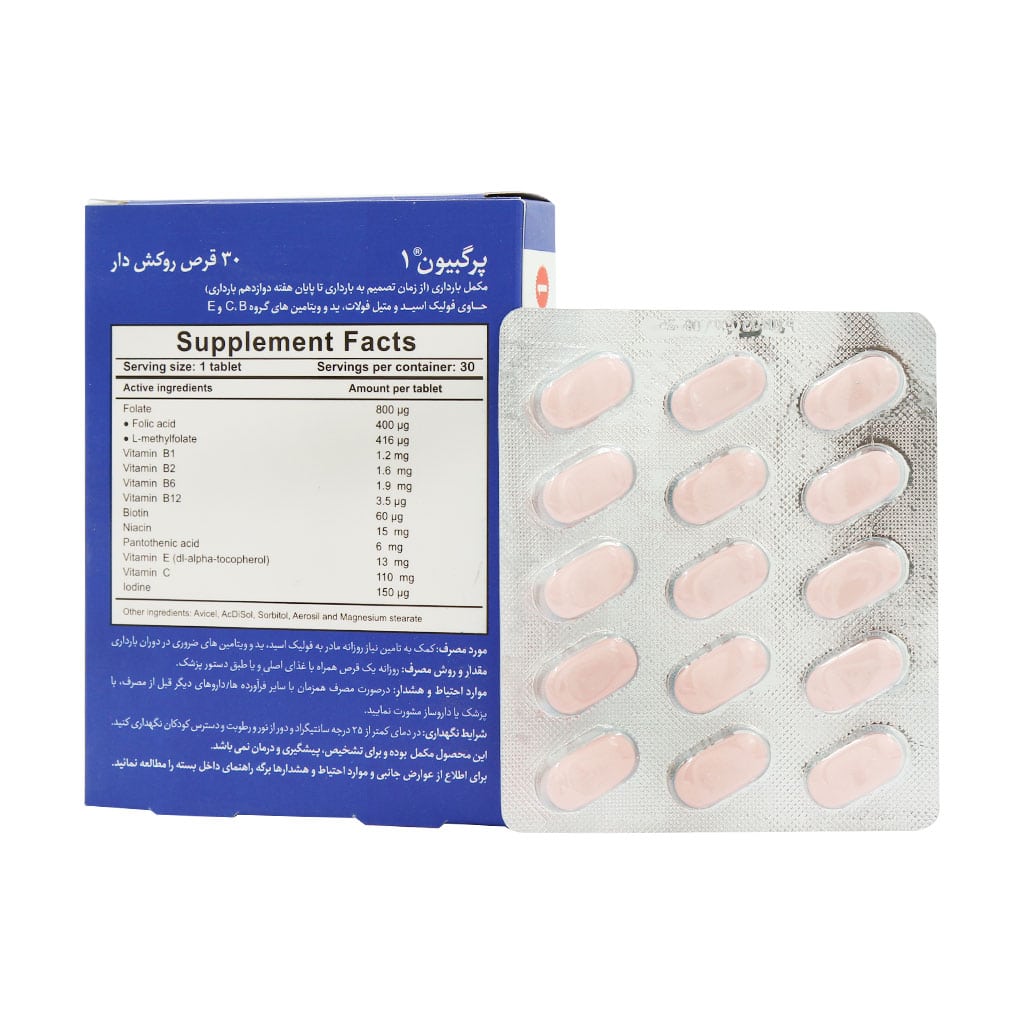قرص پرگبیون 1 بی اس کی حاوی فولیک اسید، متیل فولات، ید و ویتامینهای گروه B، C و E یک مکمل ایده آیده آل جهت کمک به حفظ سلامت مادر و جنین است. از این مکمل میتوانید از زمان تصمیم به بارداری تا پایان هفته دوزادهم بارداری استفاده نمایید و از فواید آن بهره مند شوید.