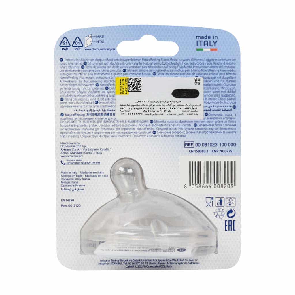سر شیشه Natrual Feeling چیکو 2 ماهگی به بالا با جنس سیلیکونی خود توانسته دوام و کیفیت بالایی داشته باشد. این محصول در ایتالیا تولید شده و طراحی بسیار جالبی دارد. با طراحی منحصر به فرد این محصول از نفخ کودک خود جلوگیری کنید. استفاده از سیلیکون در ساختار سر شیشه چیکو سبب نرمی و انعطاف آن شده است. برند چیکو تلاش کرده است در طراحی این سر شیشه از سینه مادر شبیه سازی کند، تا بتواند همان آرامش را برای نوزاد در آغوش مادر فراهم سازد.