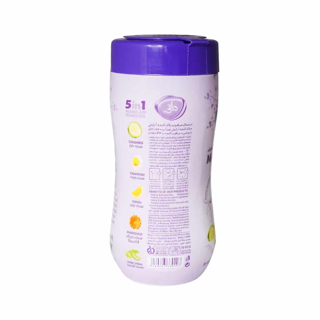 دستمال مرطوب پاک کننده آرایش پنبه ریز حاوی انواع عصاره ها و مناسب برای پاک کردن انواع آرایش حتی آرایش های ضد آب می باشد.