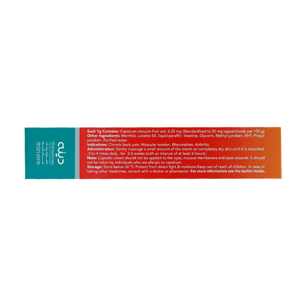 کرم کاپسیدین از عصاره استاندارد شده فلفل (Capsicum annuum) تهیه شده است و هر 100 گرم آن دارای 50 میلی گرم ماده موثره (total capsaicinoids) می باشد. ویتامین C و مقادیر قابل توجهی کاروتنوئید از دیگر ترکیبات مهم عصاره فلفل می باشند.