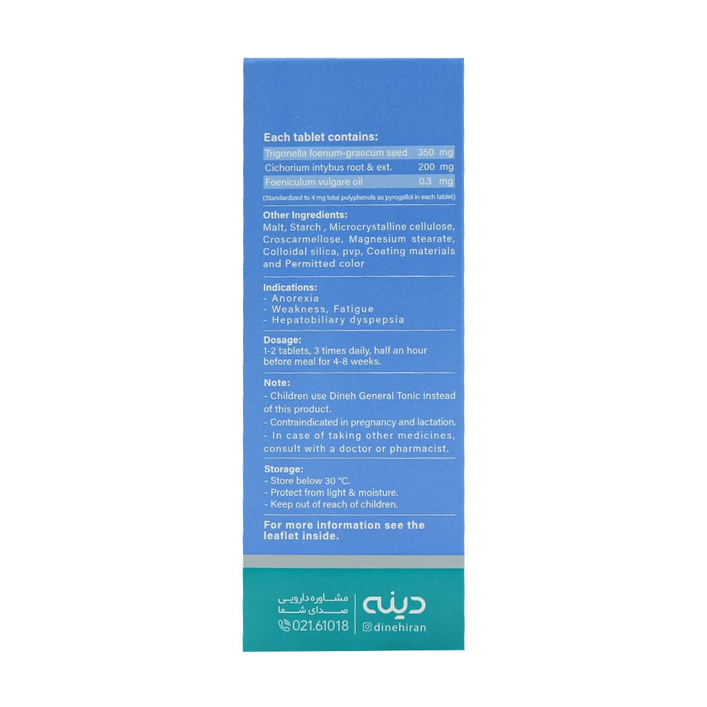 تهیه شده از عصاره ریشه کاسنی دانه شنبلیله و اسانس رازیانه و به میزان 4 میلی گرم پلی فنل تام بر مبنای پیروگالل در هر قرص استاندارد شده است.