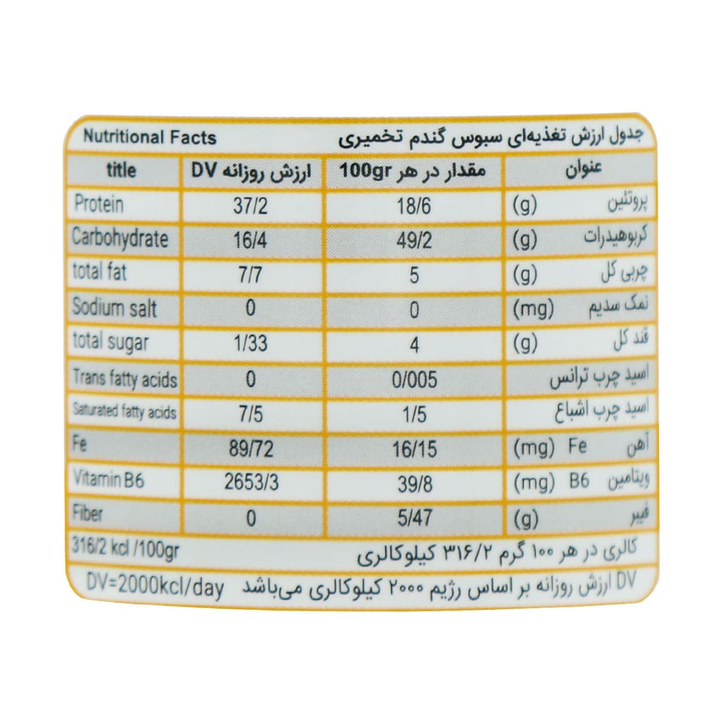 | ترکیبات | مقدار در هر 100 گرم | درصد نیاز مصرف روزانه |
