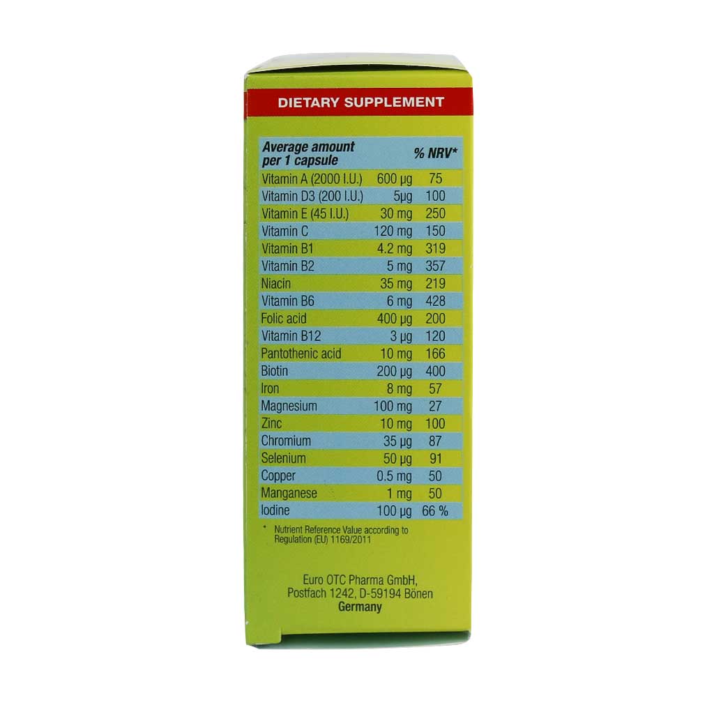 روغن جوانه سویا، ژلاتین گاوی، اکسید منیزیم، اسید آسکوربیک (C)، گلیسیرین جاذب رطوبت، دی ال- آلفا توکوفرول استات، نیکوتین آمید (B3)، سولفات روی، آهن (II)، کلسیم D-پانتوتنات (B5)، امولسیفایر لستین سویا، پیریدوکسین هیدروکلراید (B6)، تیامین مونونیترات (B1)، ریبوفلاوین (B2)، آب، رنگ E 172، منگنز سولفات، ویتامین، سولفات مس، اسید فولیک (B9)، سیانوکوبالامین (B12)، بیوتین (B7)، کوله کلسیفرول (D3)، کروم (III) -کلراید، ید پتاسیم، سدیم سلنات