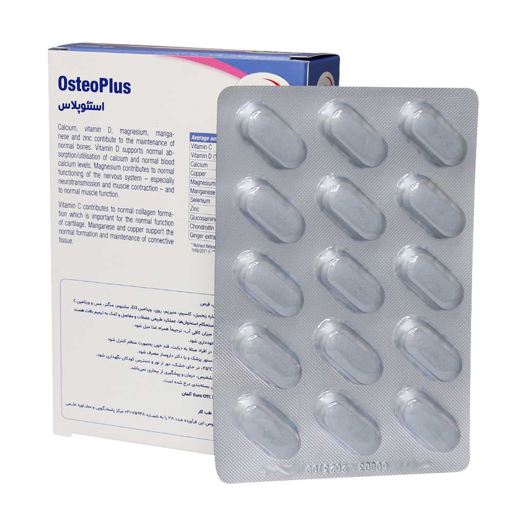 قرص استئوپلاس حاوی ترکیب منحصر به فردی از گلوکزامین، کندروئیتین، زنجبیل، کلسیم، منیزیم، روی، سلنیوم، منگنز، مس، ویتامین C و D3 با مقادیر مناسب جهت حفظ سلامت استخوان ها و مفاصل می باشد.