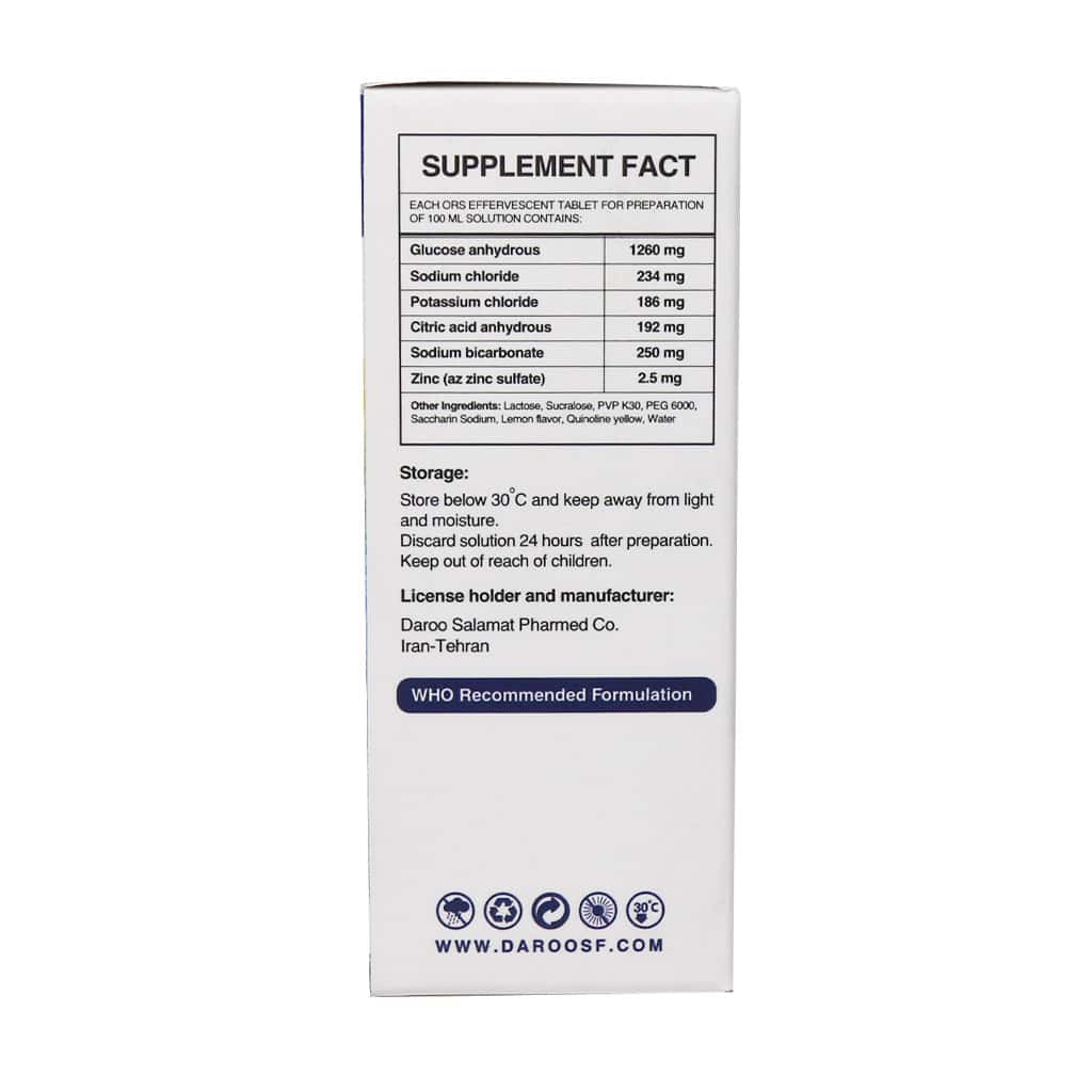 یک عدد قرص جوشان برای آماده سازی 100 میلی لیتر محلول خوراکی فرموله شده است. هر زمان که نیاز به جبران آب و املاح بدن است، یک عدد قرص را در یک لیوان حاوی 100 میلی لیتر آب اضافه کنید و پس از انحلال کامل بر اساس میزان مورد نیاز میل نمایید.