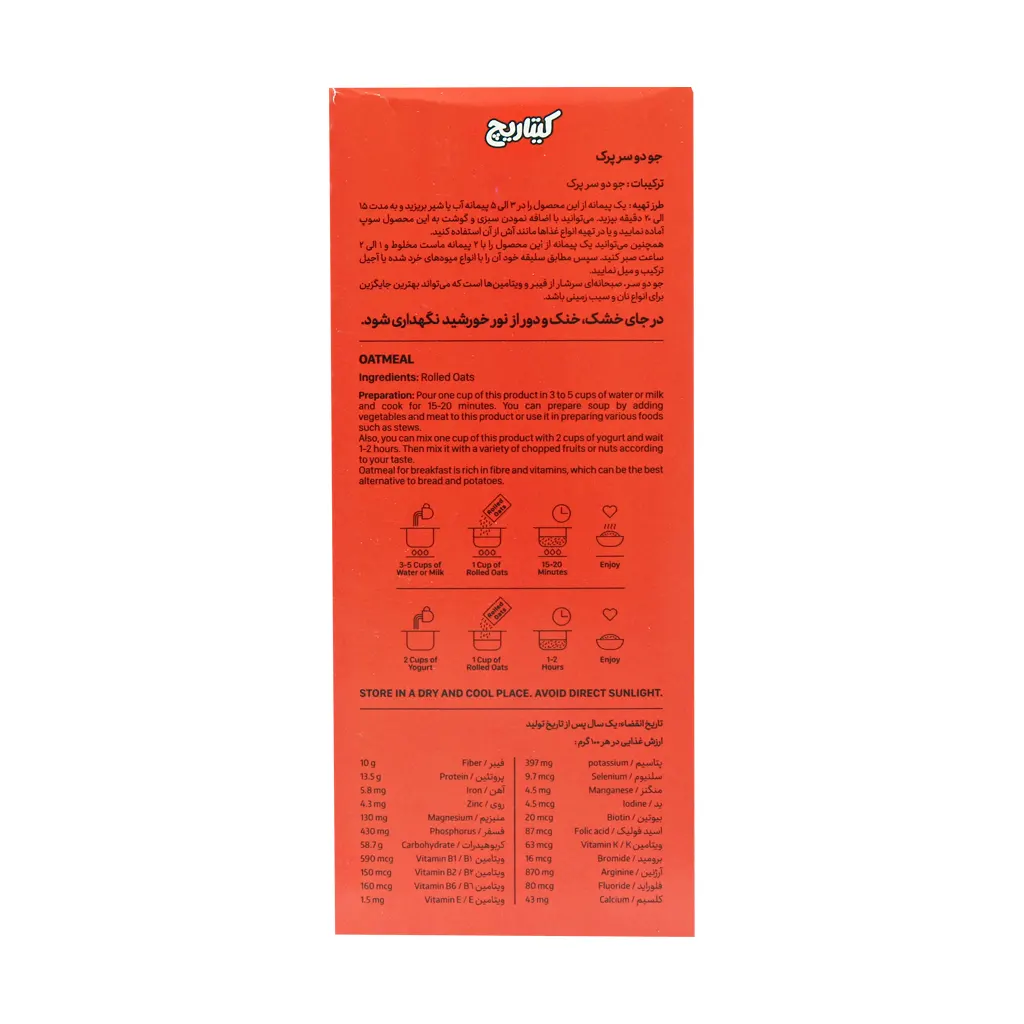 جو دو سر پرک کیتاریچ صبحانه ای سرشار از فیبر و ویتامینها است که میتواند بهترین جایگزین برای انواع نان و سیب زمینی باشد. جو دو سر پرک یک غله کامل و سرشار از مواد معدنی، کربوهیدرات پیچیده با پروتئین بالاست. این محصول نقش زیادی در رژیمهای مختلف لاغری و بدنسازی دارد و به روشهای مختلف باعث افزایش سلامتی میشود. از جمله خواص جو دوسر میتوان به سلامت قلب، لاغری، سلامت کودکان، دیابت، درمان پوکی استخوان، بهبود خواب، افزایش انرژی و سلامت پوست و مو اشاره کرد. طبع جودوسر معتدل است. این ماده مقوی حاوی منیزیم، فسفر، روی، منگنز، سلنیوم و آهن است و فاقد گلوتن است. از طرفی این محصول برای زیبایی و سلامت پوست و مو مفید است و به راحتی دیابت نوع 2 را کنترل کرده و از یبوست جلوگیری میکند.