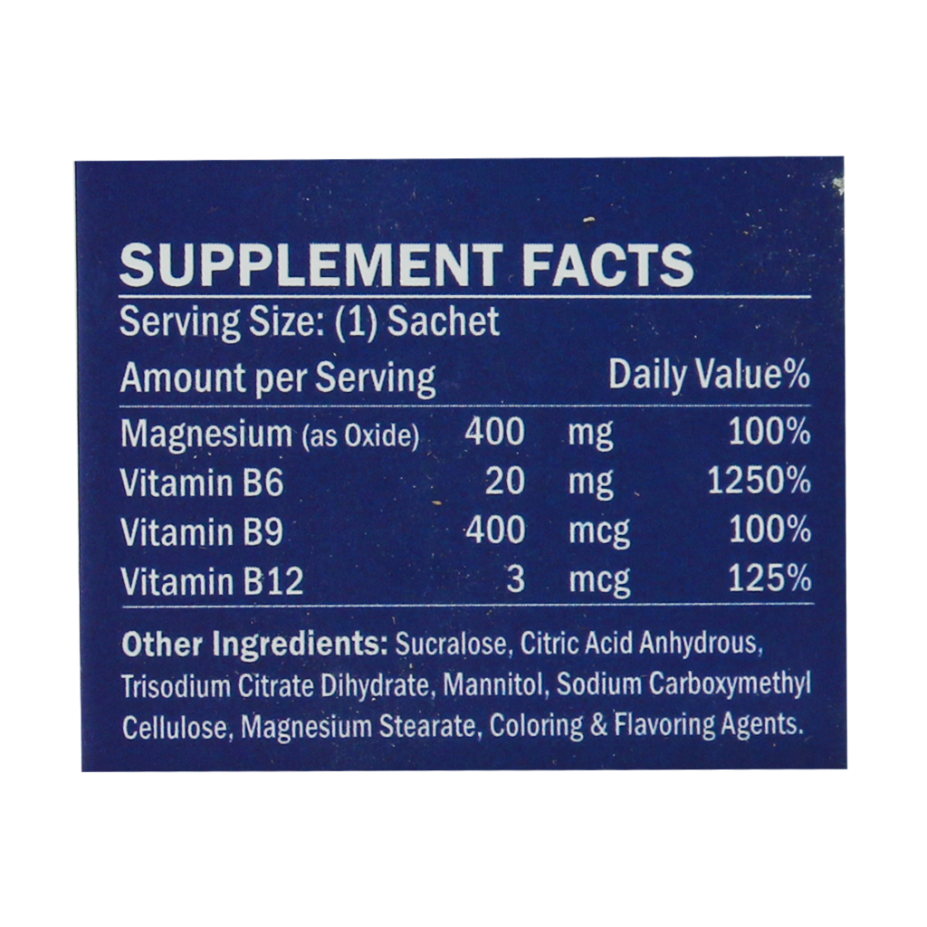 روزانه محتویات یک عدد ساشه منیزیم، ویتامین B6، B9 و B12 را روی زبان ریخته تا به آرامی حل شود. (بدون نیاز به آب)