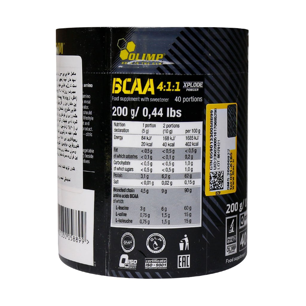 پودر بی سی ای ای اکسپلود 4:1:1 الیمپ محصولی مناسب جهت تامین 3 اسید آمینو ضروری بدن شامل ایزولوسین، لوسین و وانیل است. بنابراین با استفاده از این محصول تخریب عضلات بعد از تمرین اتفاق نمیافتد و عضله سازی هم با کیفیت بهتری اتفاق میافتد.