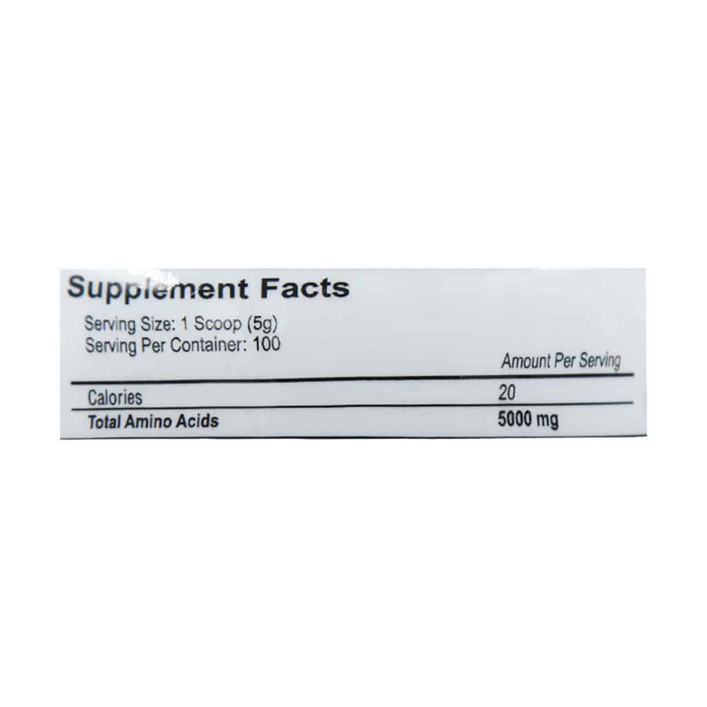 لوسین، ایزولوسین، والین، ال لیزین، ال هیستیدین، ال متیونین، فنیل آلانین، ال آلانین، ال آرژنین، ال گلوتامین، گلایسین، ال پرولین، ال سرین، تائورین، تیروزین، بتا آلانین، ال کارنیتین، آسپارتیک اسید، گلوتامیک اسید، ال سیترولین، تریپتوفان، سیستئین، آسه سولفام پتاسیم، اسانس و رنگ مجاز خوراکی