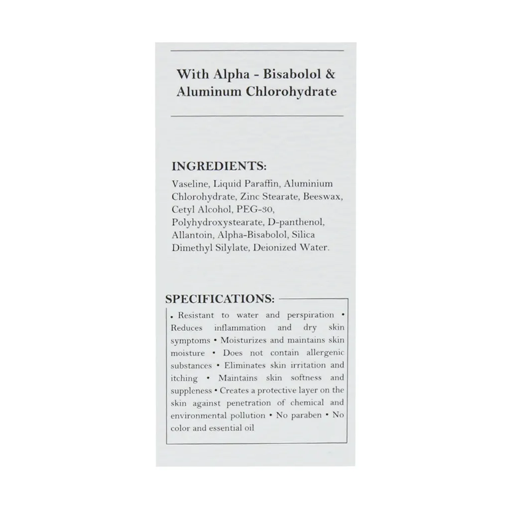 وازلین، پارافین مایع، آلومینیوم، کلروهیدرات، استئارات روی، موم زنبور عسل، ستیل الکل، پی ای جی 300 دی، پلی هیدروکسی استئارات، پانتنول.دی، آلانتوئین، آلفا بیسابولول، سیلیکا دی متیل سیلیلات، آب دیونیزه