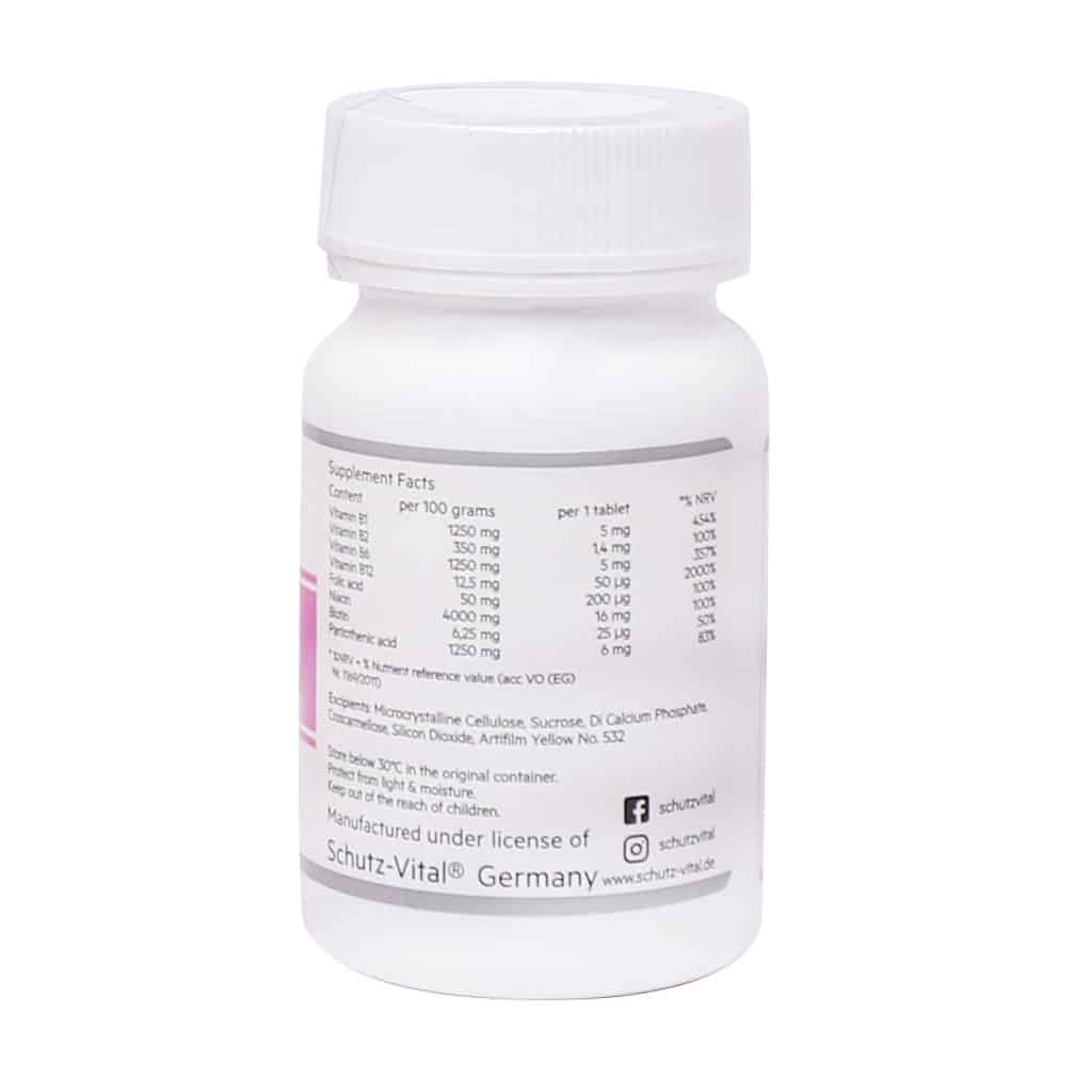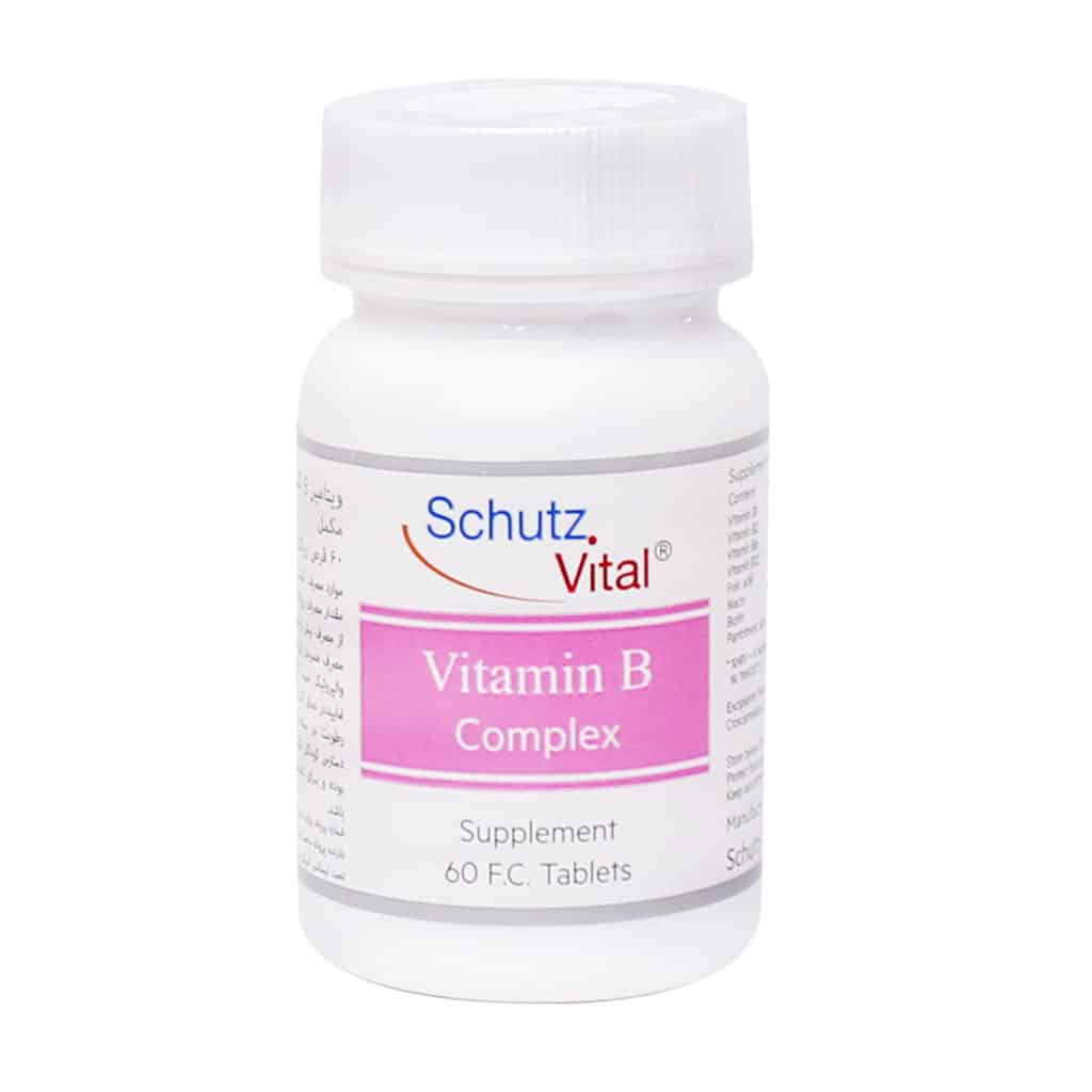 قرص روکشدار ب کمپلکس شوتس ویتال یک مکمل غذایی بوده که نیاز روزانه بدن به ویتامینهای گروه B را تامین میکند. قرص ب کمپلکس حاوی ویتامینهای تیامین، ریبوفلاوین، نیاسین، پانتوتنیک اسید، پیریدوکسین، بیوتین، فولات و کوبالامین است. این مکمل خستگی مزمن را کاهش داده و موجب افزایش انرژی میشود. بهبود خلق و خو، کاهش استرس، درمان افسردگی، کمک به رشد مغز جنین، جلوگیری از ریزش مو، افزایش تستوسترون، کاهش حالت تهوع، ممانعت از بروز میگرن، تسریع روند بهبود زخم و کاهش علائم سندروم پیش از قاعدگی از جمله فواید ویتامین ب کمپلکس موجود در این قرص است.