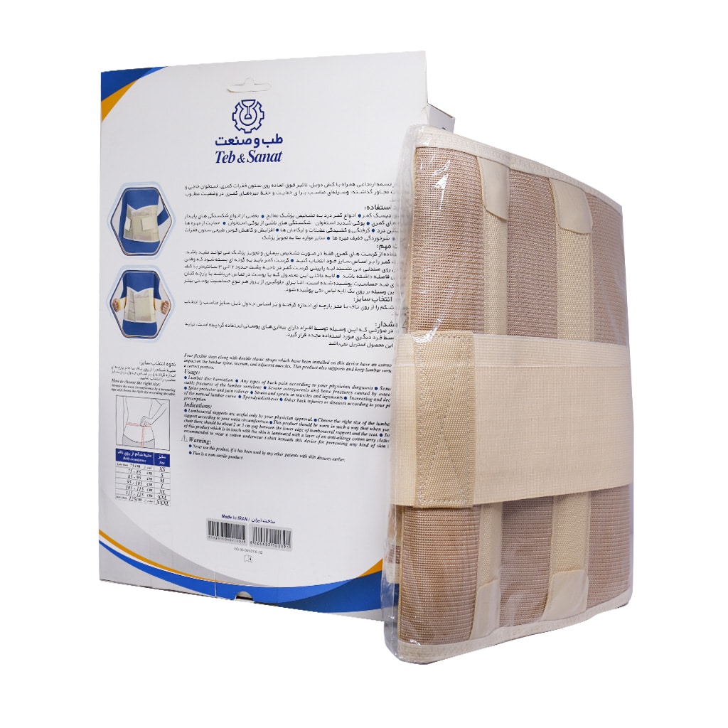 کرست کمر لومبو ساکرال با کش دوبل طب و صنعت با چهار تسمه ارتجاعی همراه با کش دوبل، تاثیر فوق العاده روی ستون فقرات کمری، استخوان خارجی و عضلات مجاور داشته و وسیله ای مناسب برای حمایت و حفظ مهره های کمری در وضعیت مطلوب می باشد و باعث ثابت نگهداشتن ماهیچه ها و رباط های کمر می گردد. همچنین با فشار تدریجی که به ناحیه کمر و استخوان خارجی در قسمت انتهایی نخاع وارد می کند باعث کاهش درد می گردد.