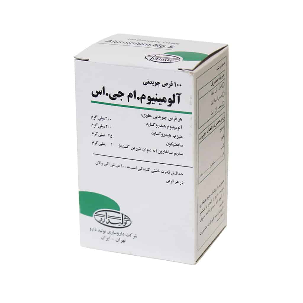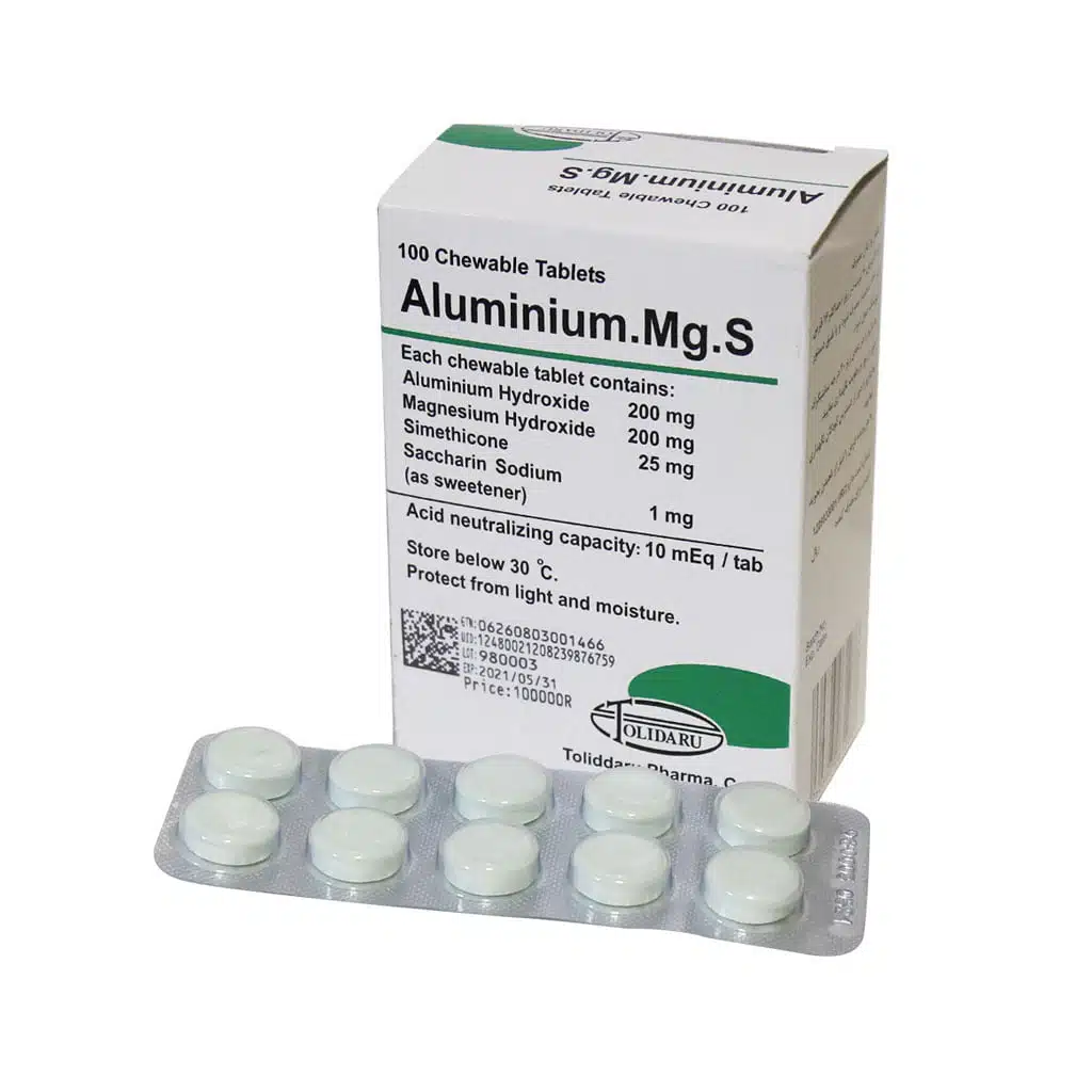 قرص جویدنی آلومینیوم. ام جی. اس حاوی هیدروکسید آلومینیم، هیدروکسید منیزیوم و سایمتیکون است. این ترکیب برخی از عوارض هریک از ترکیباتش به تنهایی را دارد ولی با توجه به اینکه هیدروکسید منیزیوم موجب اسهال میشود و هیدروکسید آلومینیم موجب یبوست در این دارو اثر هر دو بر هم خنثی میشود. این محصول جهت کاهش دهنده ریفلاکس (بازگشت محتویات معده به مری)، جلوگیری از تخریب مخاطی گوارش ناشی از استرس، درمان اسیدی شدن معده همراه با نفخ (باد شکم) و درمان اولسر دئودنال و معدی مورد مصرف قرار میگیرد.