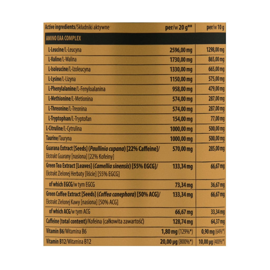 پودر آمینو EAA گلد کر لاین ترک نوتریشن یک مکمل حرفه ای از آمینواسیدهای ضروری، ویتامین B6 و B12 است که به ساخت توده عضلانی، بالا بردن استقامت بدن در تمرینات، ریکاوری بعد از تمرینات و بالا بردن متابولیسم بدن به ورزشکاران کمک میکند. همچنین در مکمل آمینو ایی ای ای ترک نوتریشن مقادیری از عصاره گوارانا دیده میشود که یک نوع میوه بومی کشور برزیل و جنگلهای آمازون بوده که منبعی از آنتی اکسیدانهای مختلف و کافئین که در رفع خستگی و ریکاوری بعد از تمرینات بسیار موثر عمل میکند.