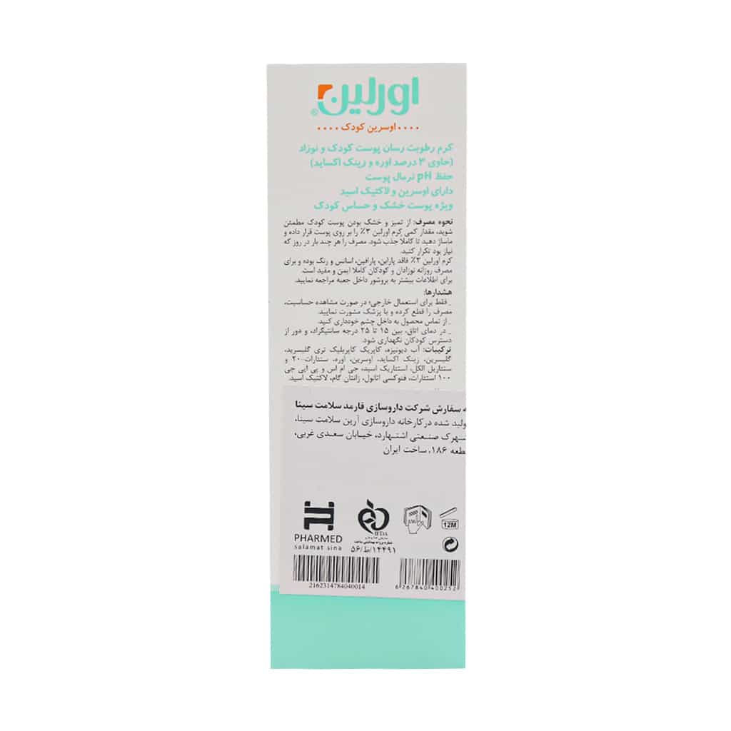 کرم اوسرین 3 درصد اورلین کودکان دارای اوسرین و اوره است. اوره موجود در این کرم به عمق لایه شاخی پوست نفوذ کرده و قادر است مقادیر زیادی مولکولهای آب را به خود جذب کرده و برای مدت طولانی نگهداری کند. اوسرین نزدیکترین چربی طبیعی به پوست انسان است و با ایجاد لایهای محافظ در سطح پوست مانع تبخیر آب پوست شده و لطافت را به پوست باز میگرداند. همچنین ترکیبات این کرم به عمق لایه شاخی پوست نفوذ کرده و قادر است مقادیر زیادی مولکولهای آب را به خود جذب کرده و برای مدت طولانی نگهداری نماید.