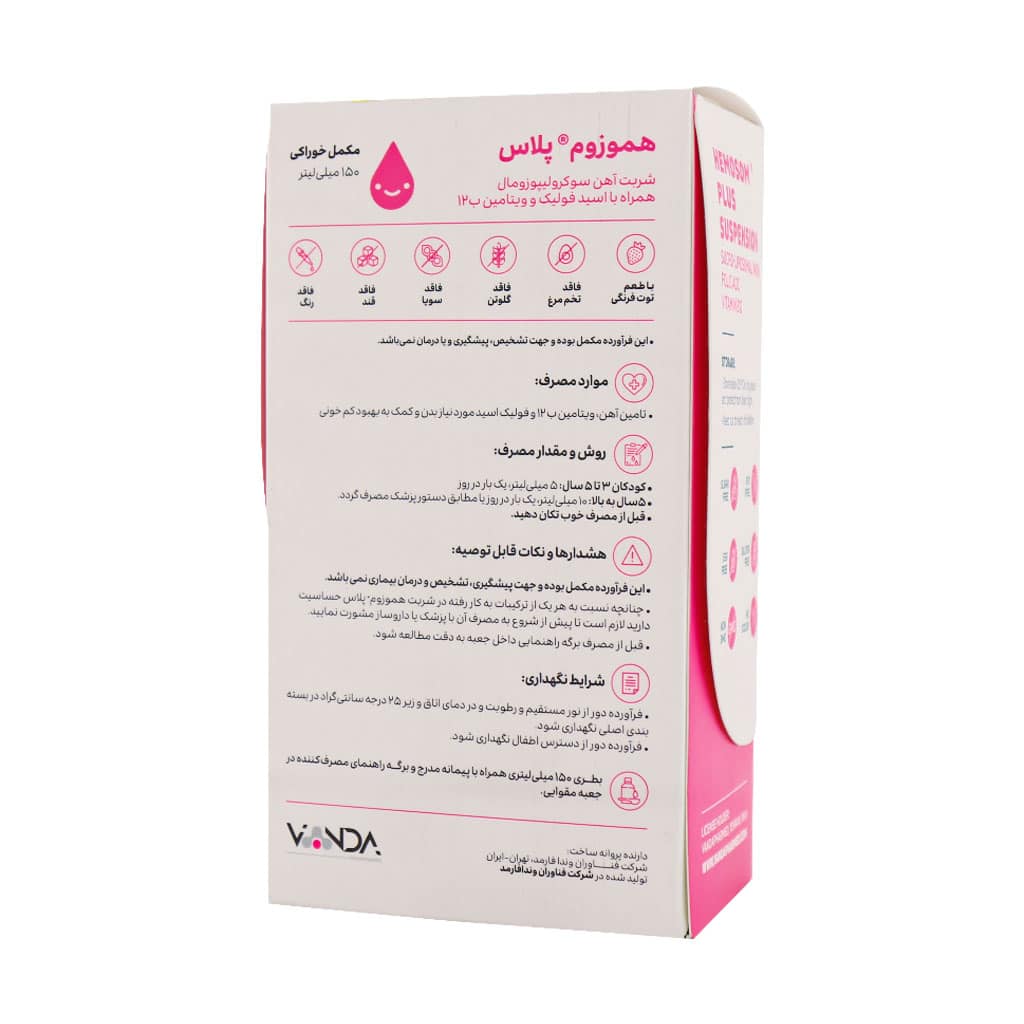 شربت هموزوم پلاس وندا فارمد با داشتن آهن سوکرولیپوزومال به همراه اسید فولیک و ویتامین ب12 به بهبود و پیشگیری از کم خونی کمک موثری میکند. نوع آهن موجود در این فرآورده به گونه ای است که عوارض گوارشی ایجاد نمیکند و از سیاه شدن دندانها پیشگیری مینماید.