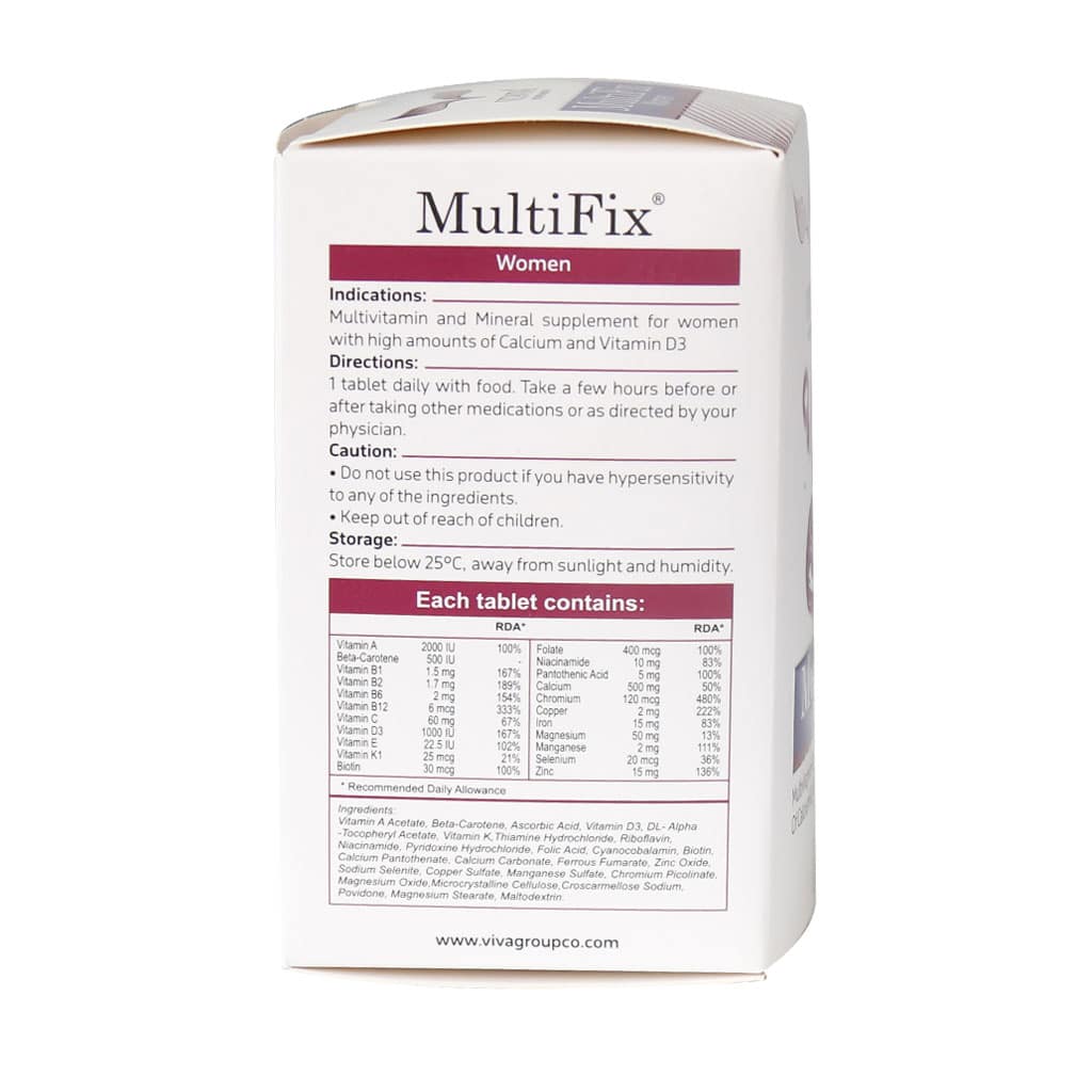 مولتی ویتامینها به پر کردن شکافهای تغذیه ای کمک کرده و موثرترین راه برای حفظ سلامت عمومی بانوان است. مصرف طولانی مدت و مداوم مولتی ویتامین مینرال مخصوص بانوان ، بدن بانوان را در مقابل بیماریها مقاوم میکند. قرص مولتی فیکس بانوان ویتاویوا حاوی مقادیر بالای کلسیم و ویتامین D3 از مکملهای ایده آل جهت تقویت سیستم ایمنی، جلوگیری از پوکی استخوان و حفاظت از ساختار استخوان است. مصرف این مکمل غذایی سطوح انرژی فرد را بالا میبرد و احساس خستگی و کسالت را از بانوان دور میکند.
