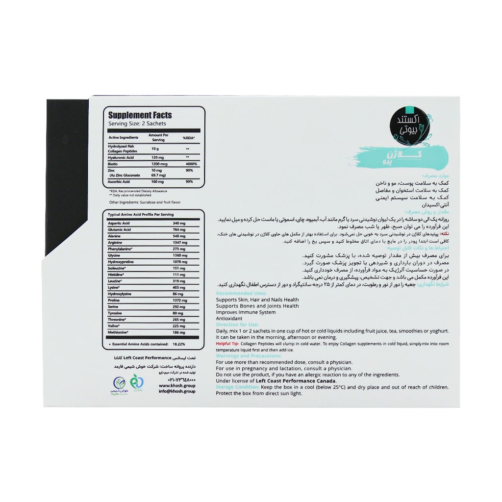 ساشه کلاژن پرو 5 در 1 اکستند بیوتی یک مکمل تغذیهای با کیفیت است که توسط شرکت خوش شیمی فارمد در ایران تولید و تحت لیسانس کانادا عرضه میشود. این محصول با ترکیبات اصلی کلاژن، بیوتین، زینک، ویتامین C و هیالورونیک اسید طراحی شده است و فواید چشمگیری برای بهبود سلامت و زیبایی پوست، مو، ناخنها و همچنین تقویت استخوانها و مفاصل دارد. به صورت کلی میتوان گفت مصرف این ساشه تاثیر چشمگیری در افزایش کیفیت زندگی و رفع مشکلات هر فرد دارد. در ادامه به تفکیک در رابطه با اثرگذاری هر یک از این ترکیبات توضیح دادهایم. شایان ذکر است میتوانید با هدف بهبود سلامت استخوان و مفاصل در کنار این محصول اقدام به خرید قرص کلسیم و استفاده از آن نمایید.